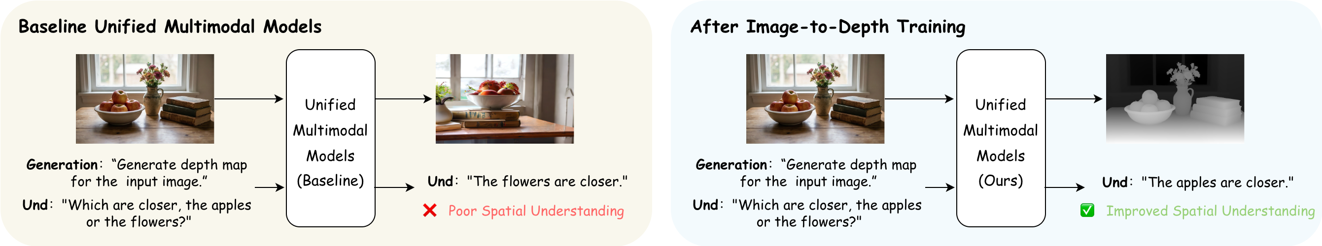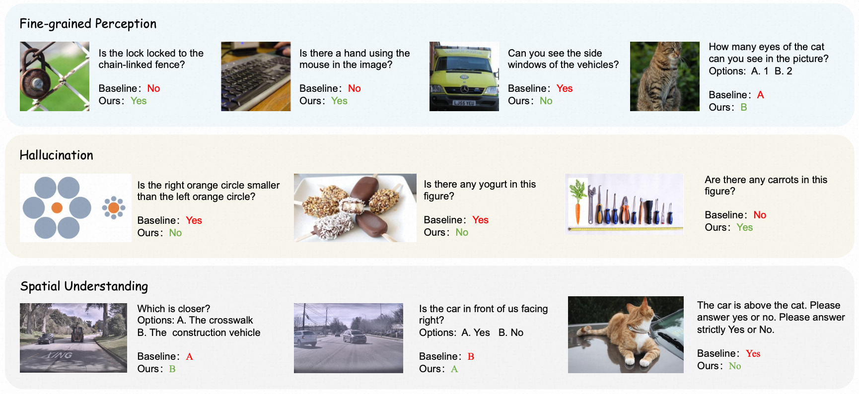 Qualitative understanding results. UMMs post-trained with UniMRG exhibit improved fine-grained perception, reduced hallucinations, and enhanced spatial understanding.