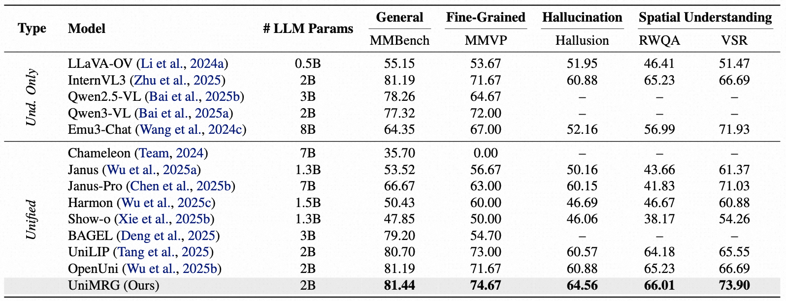 Comparison with state-of-the-arts on visual understanding benchmarks. Our model is OpenUni post-trained with UniMRG.