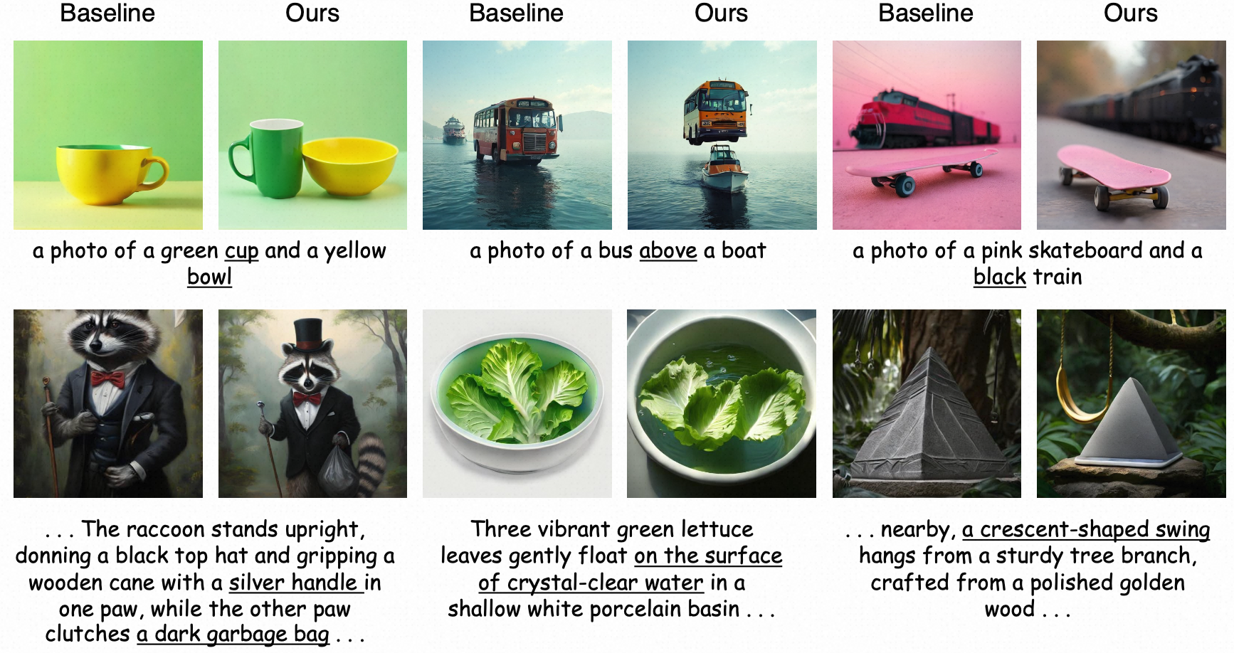 Qualitative generation results. UMMs post-trained with UniMRG better follow prompts involving multiple objects, spatial relationships, and complex attributes.