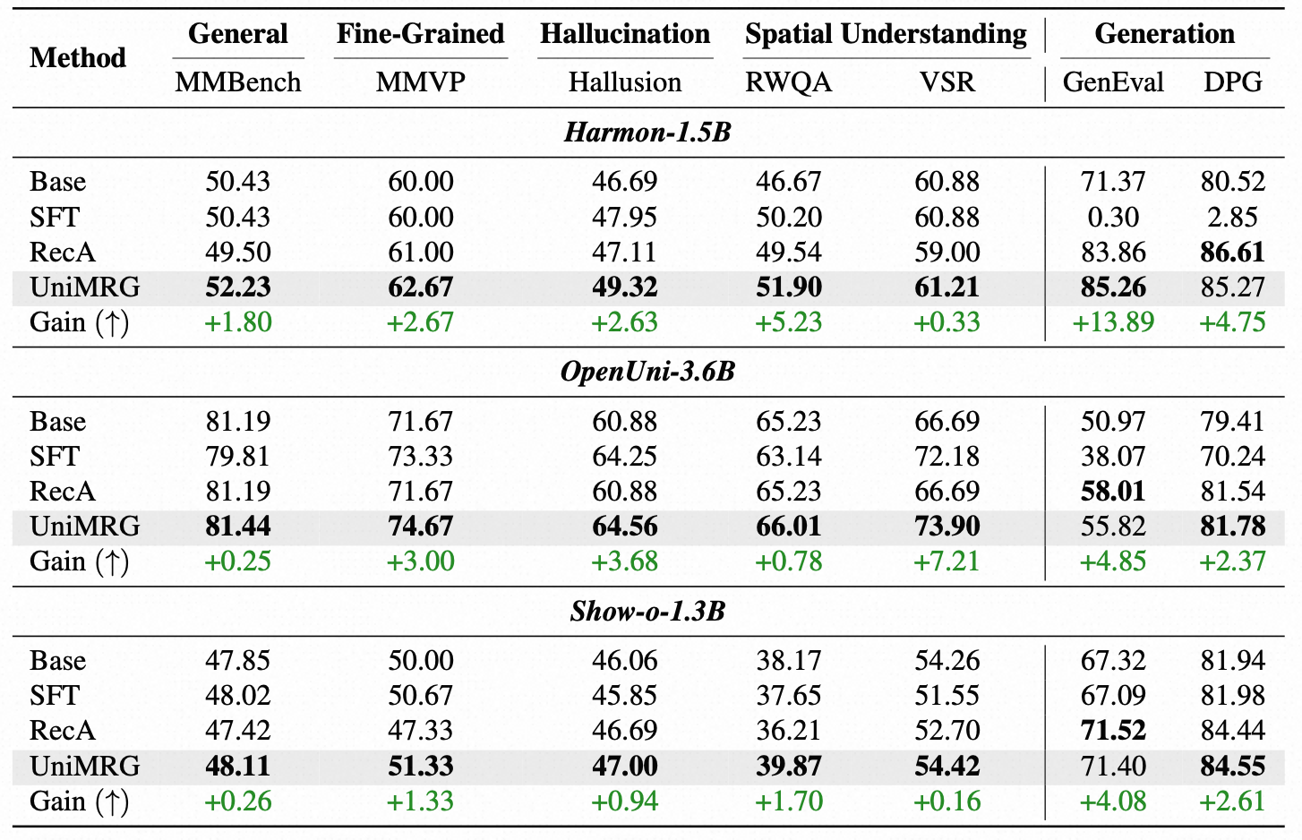 Comparison of UniMRG with other post-training methods for UMMs. The green row shows the Gain (↑) over the base model. SFT denotes supervised fine-tuning using only the visual understanding loss.